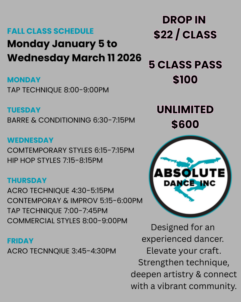 Absolute Dance reserves the right to cancel or combine any classes. The schedule and instructors are subject to change at any point throughout the dance season, without notice.